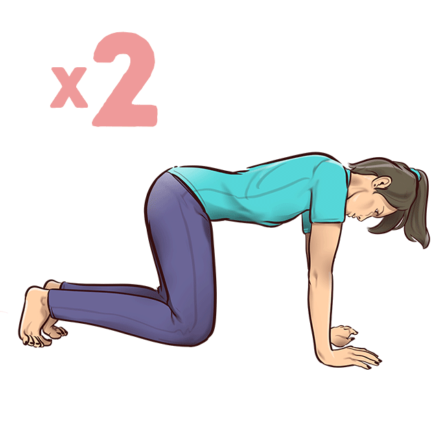 Từ từ kéo giãn lưng, gập lưng lại giống như một con mèo và hít thở sâu. Giữ nguyên tư thế khoảng 15 giây sau đó trở về tư thế ban đầu.