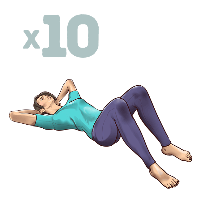 Thở ra, căng cơ bụng và nâng đầu lên khỏi mặt đất. Lưu ý không dùng lực tay mà chỉ dùng lực ở bụng để nâng người lên.